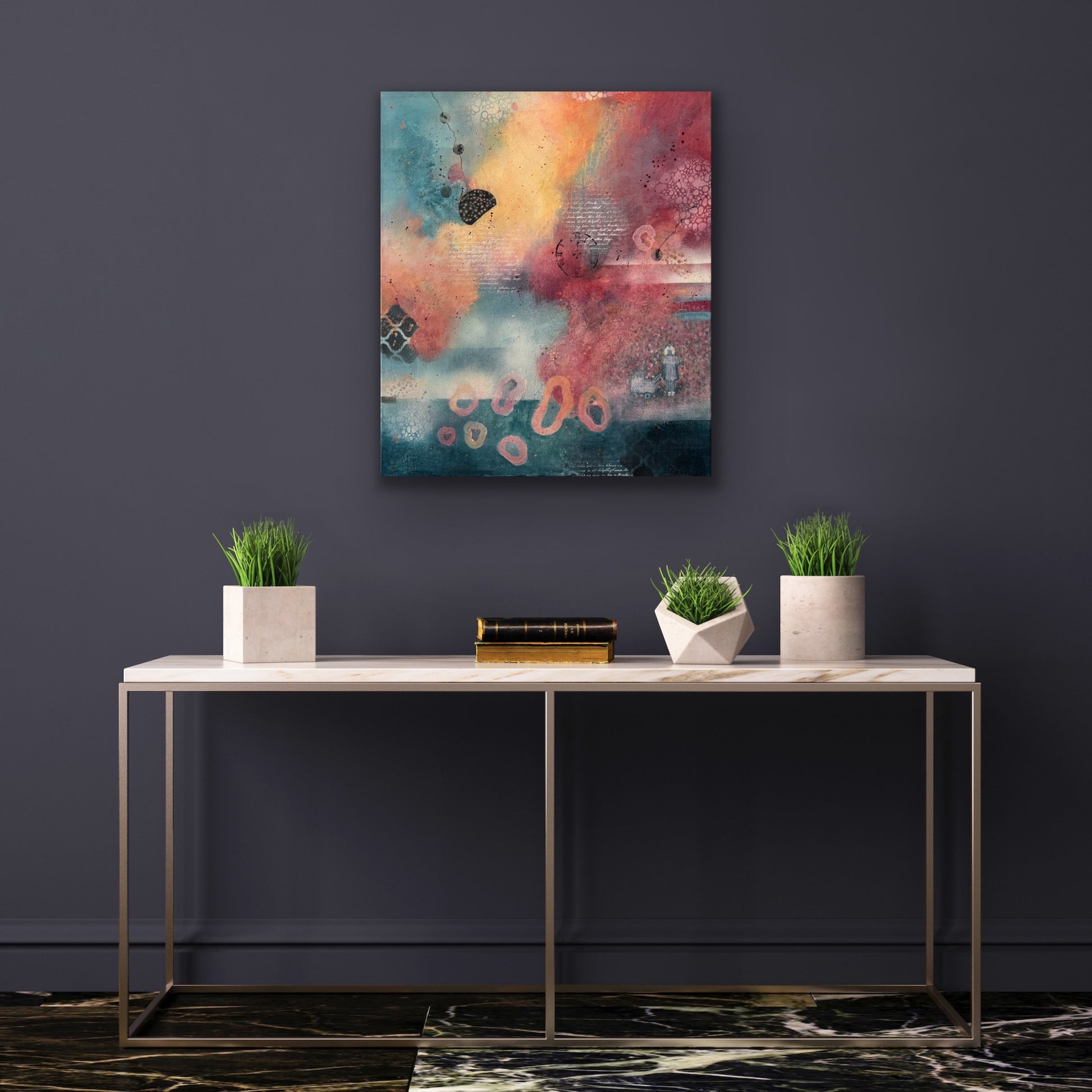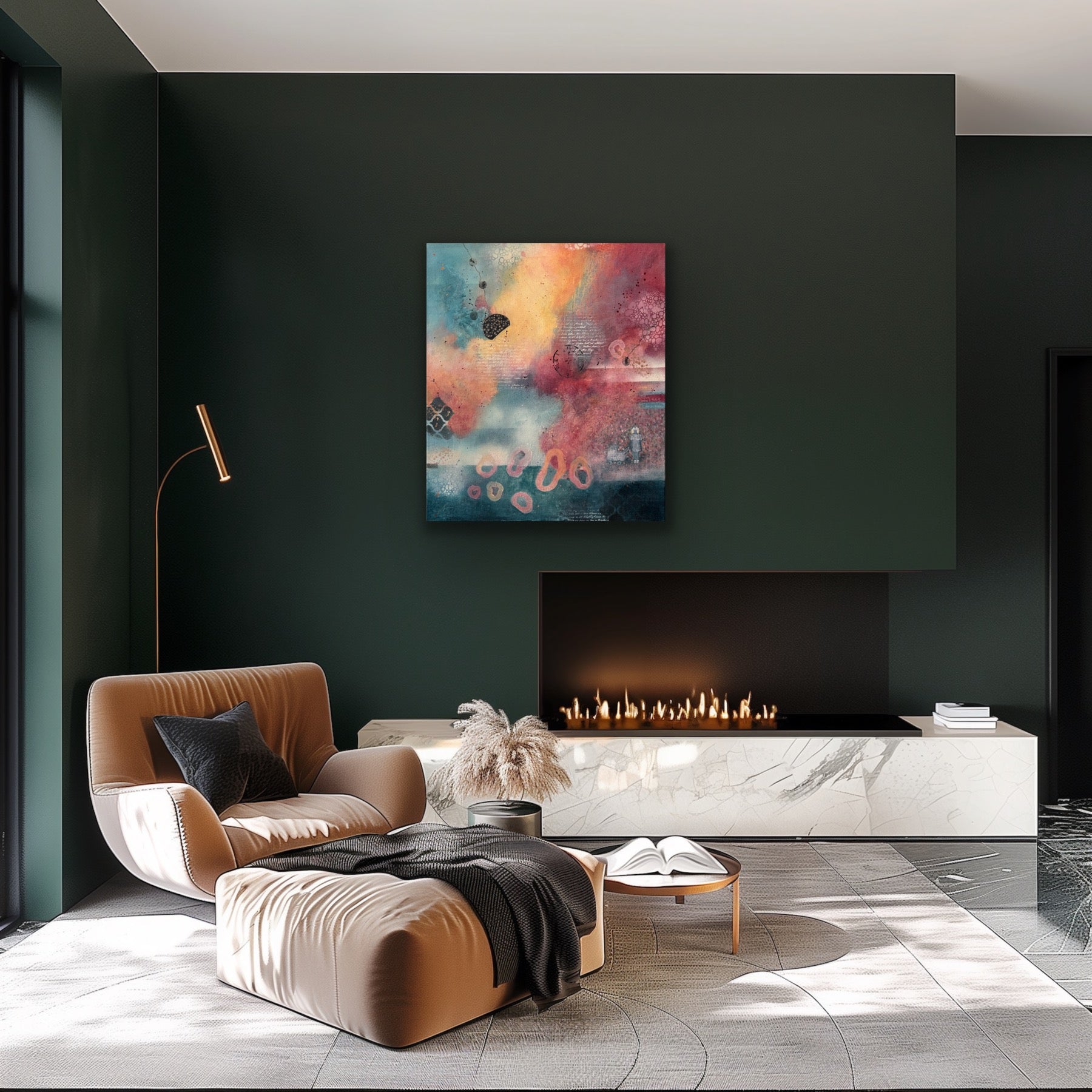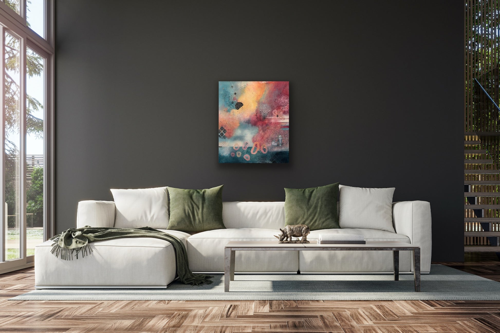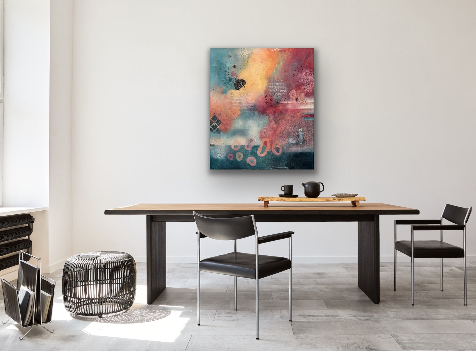 Beskrivelse: Akrylmaleri med (bestillte) symboler. Medium, kobbermaling, akrylspray