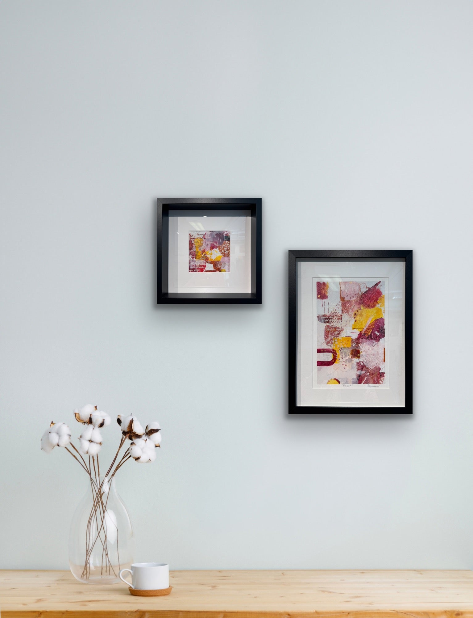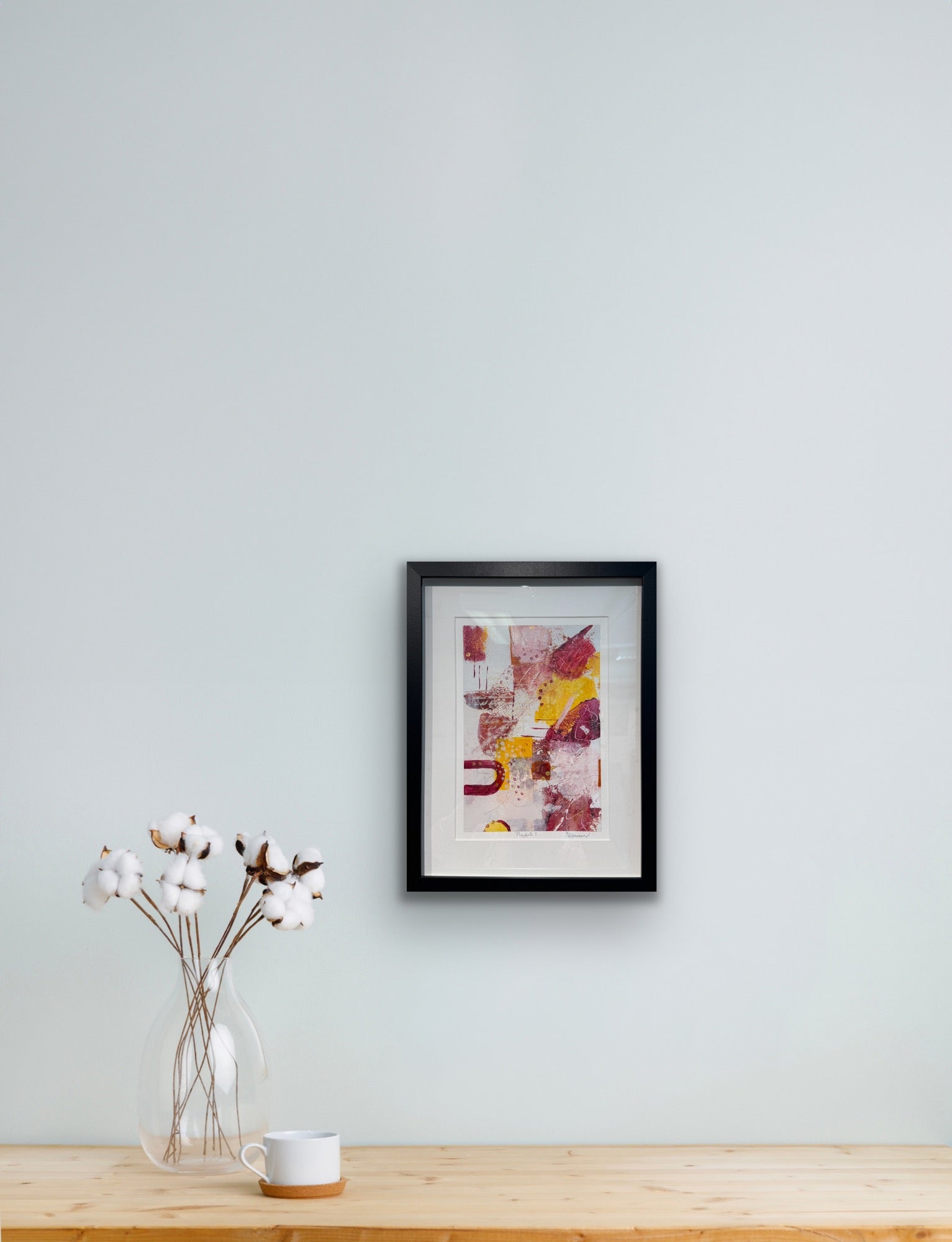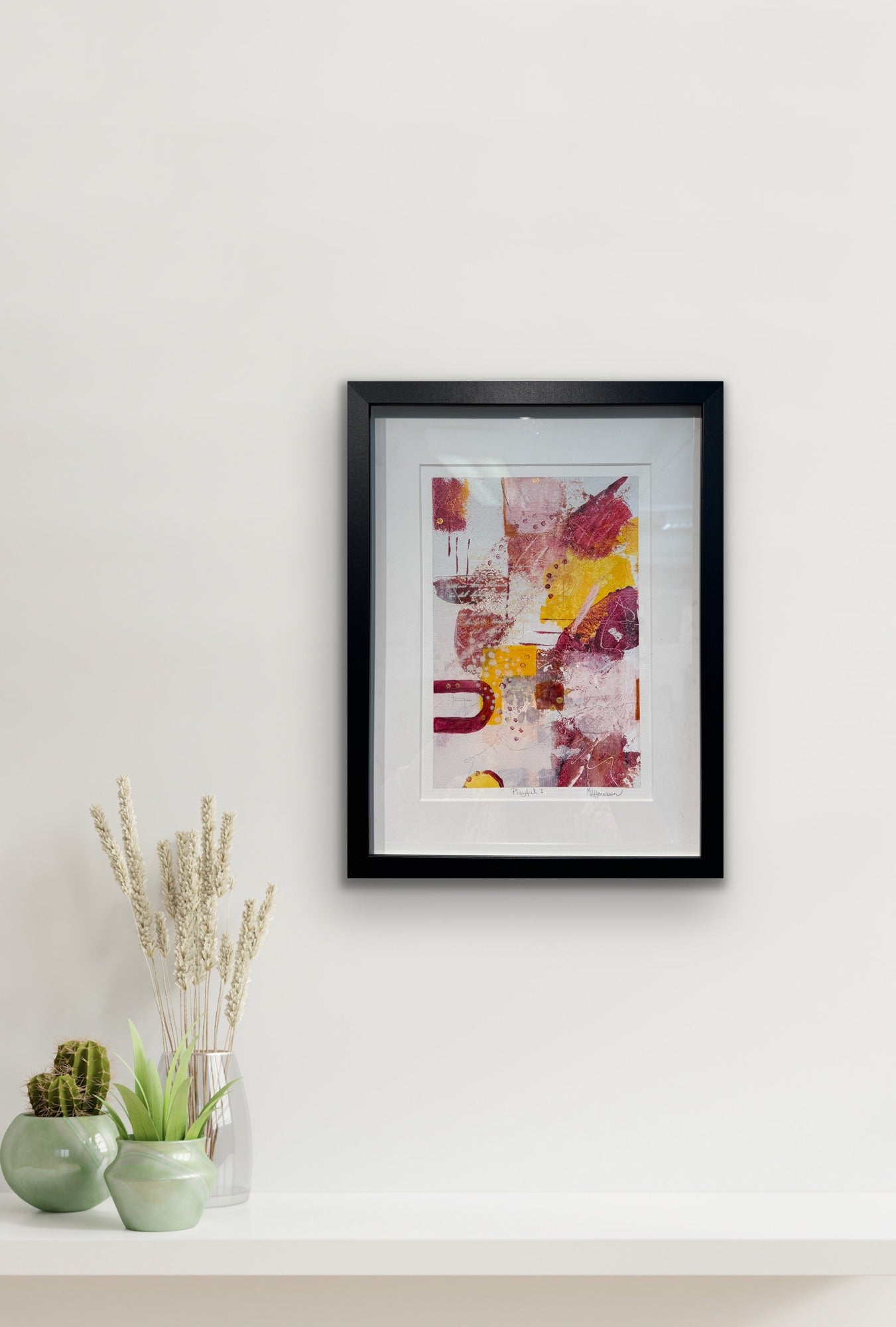 Beskrivelse: Akrylmaleri med struktur og ink på papir. Innrammet