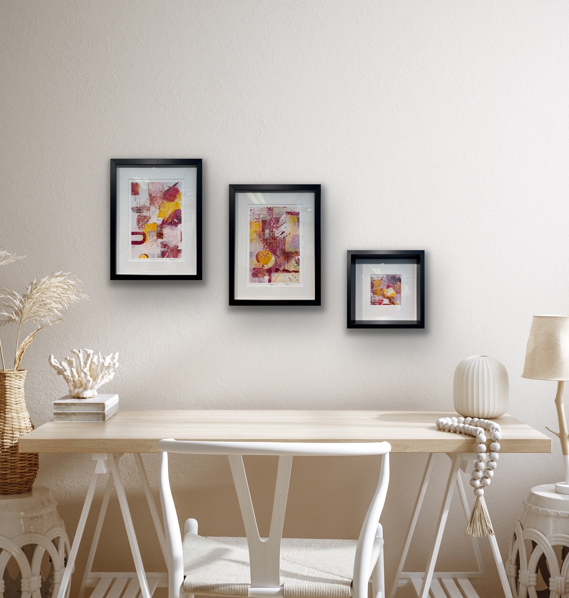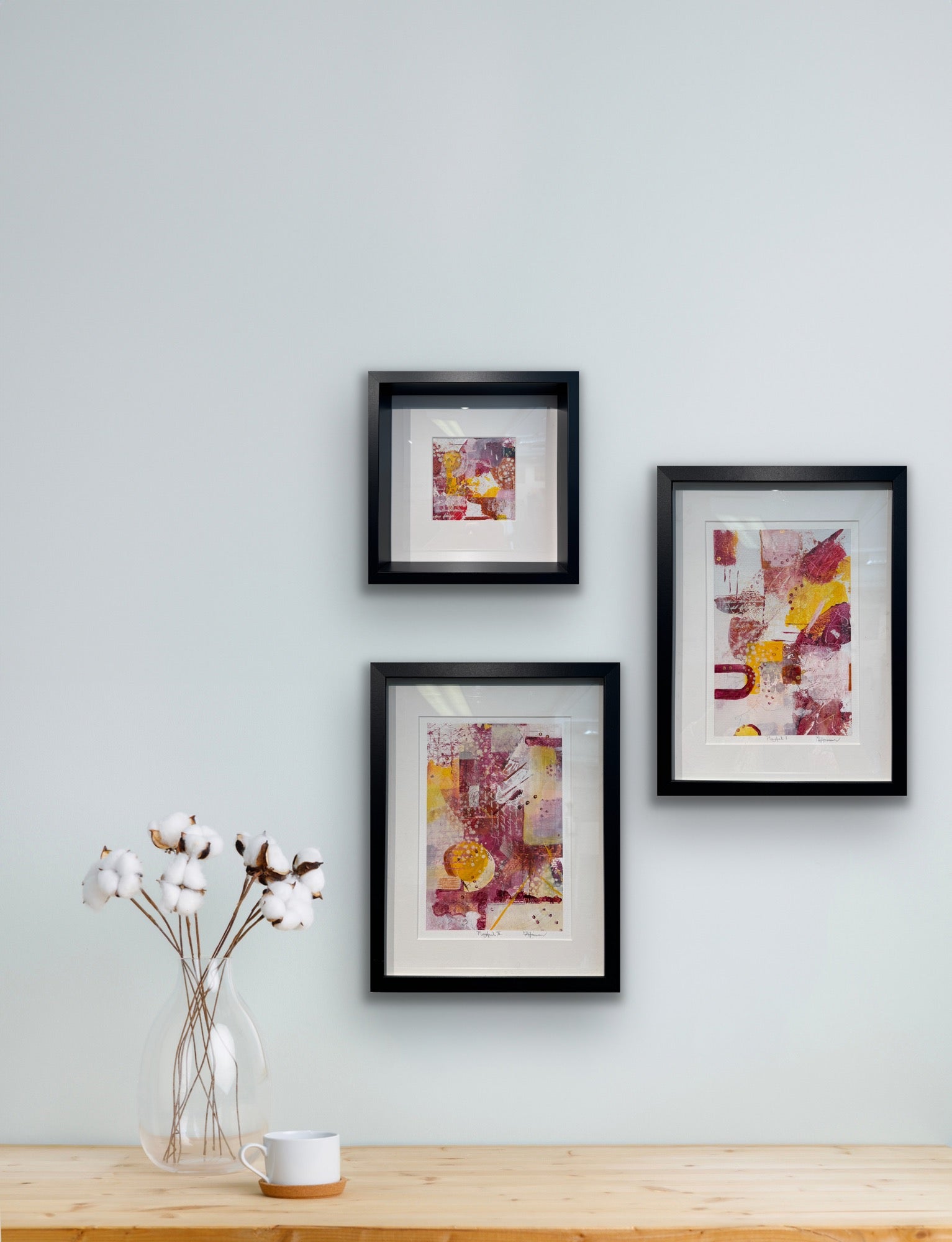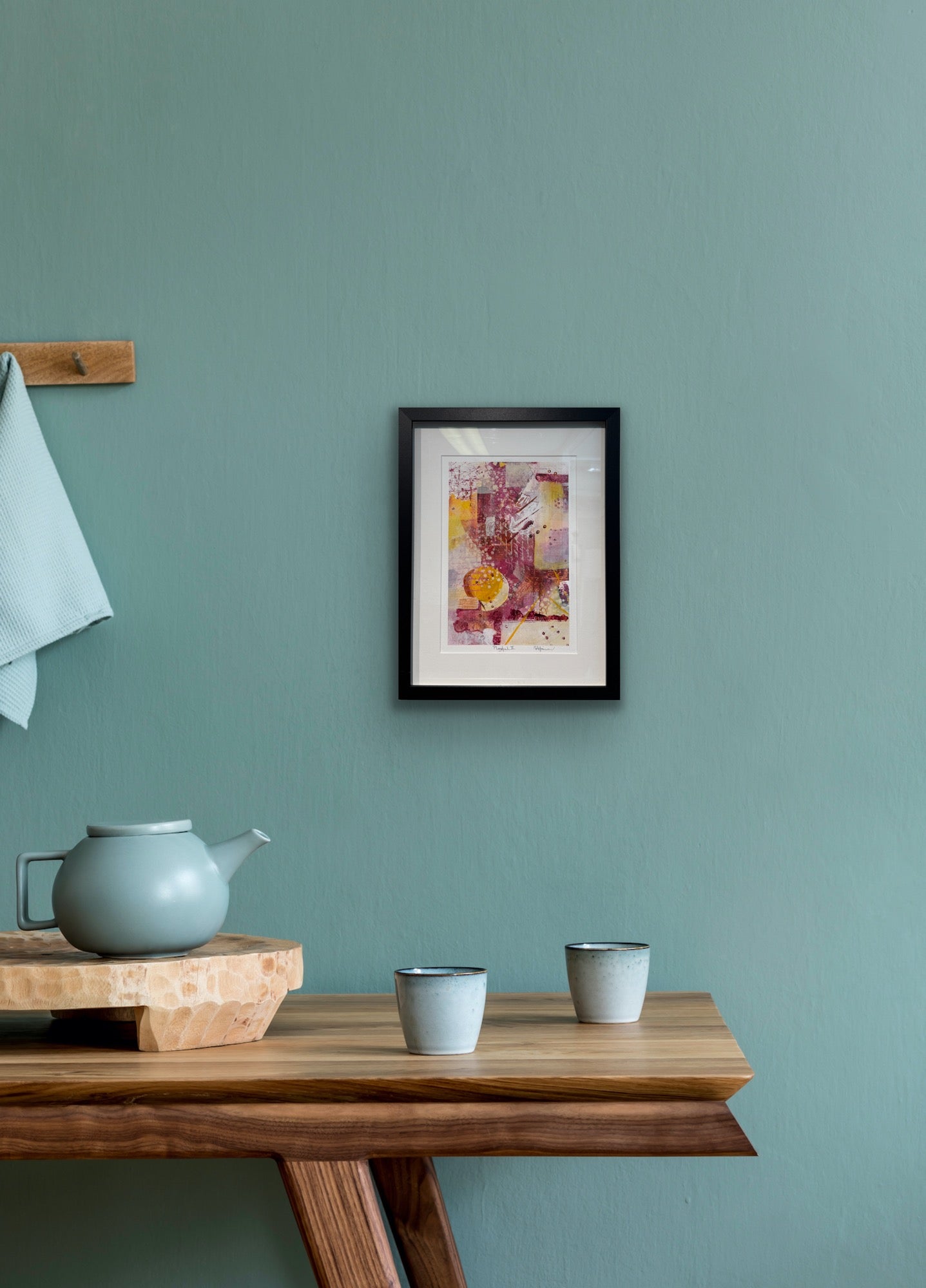 Beskrivelse: Akrylmaleri med struktur og akrylink på papir. Innrammet.