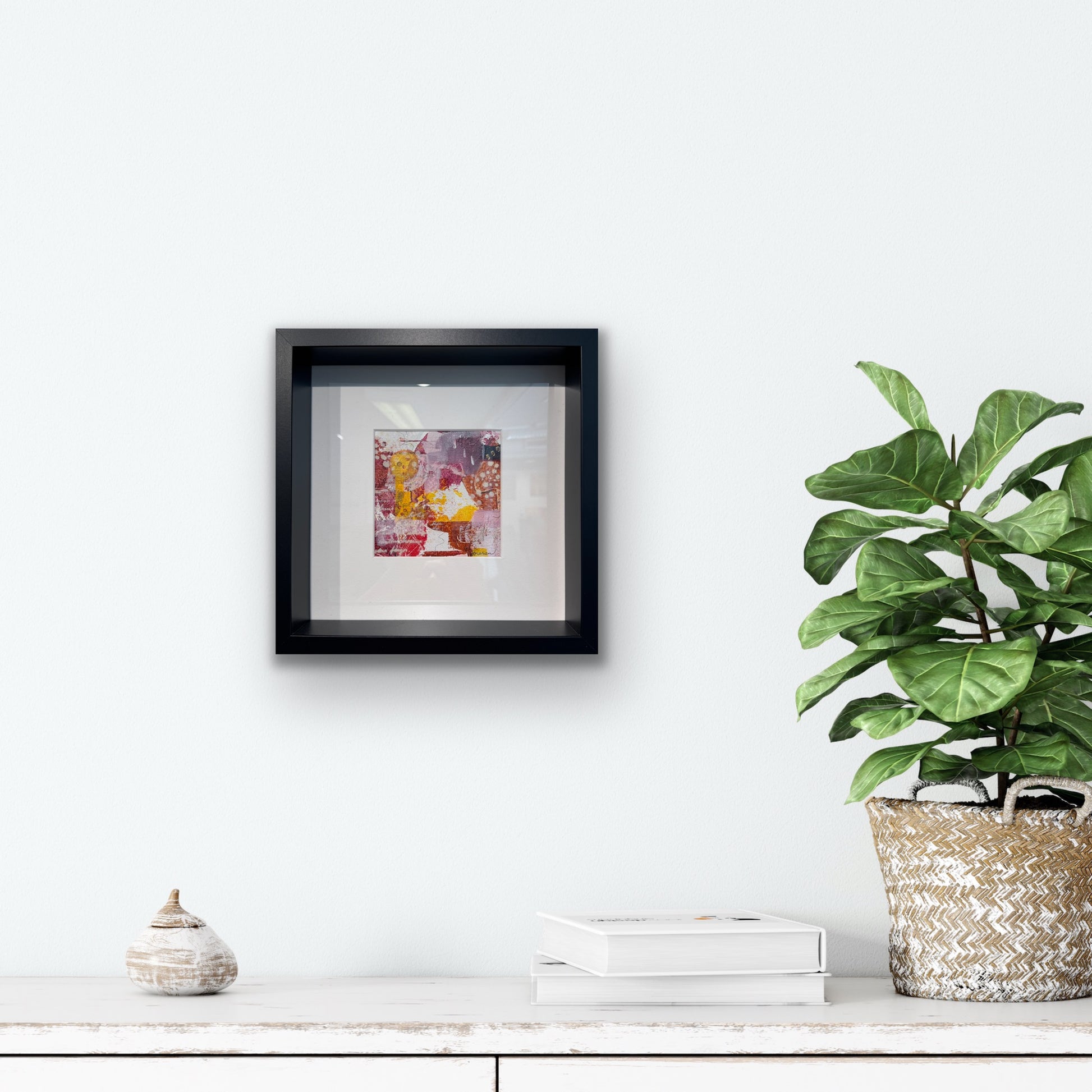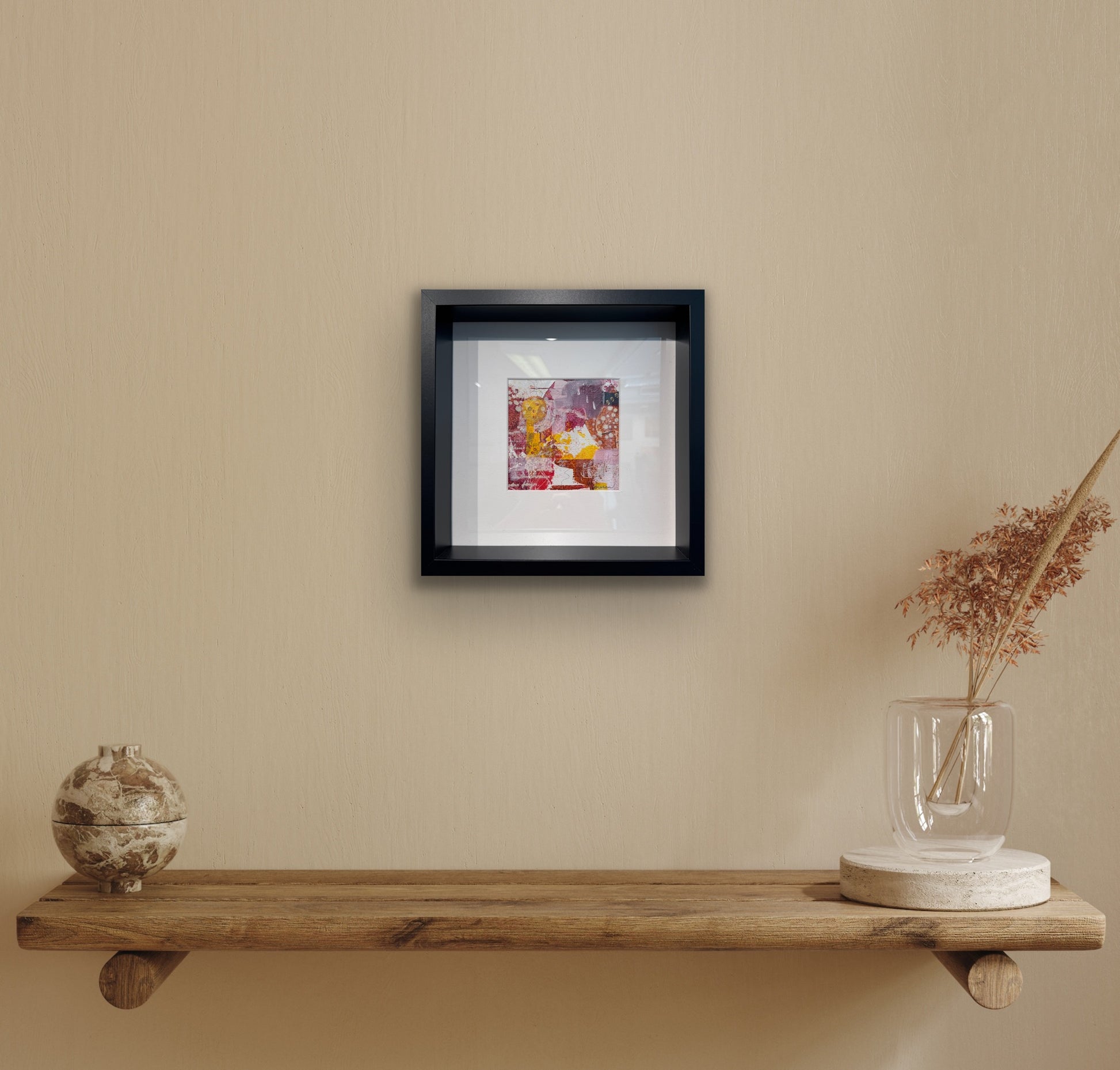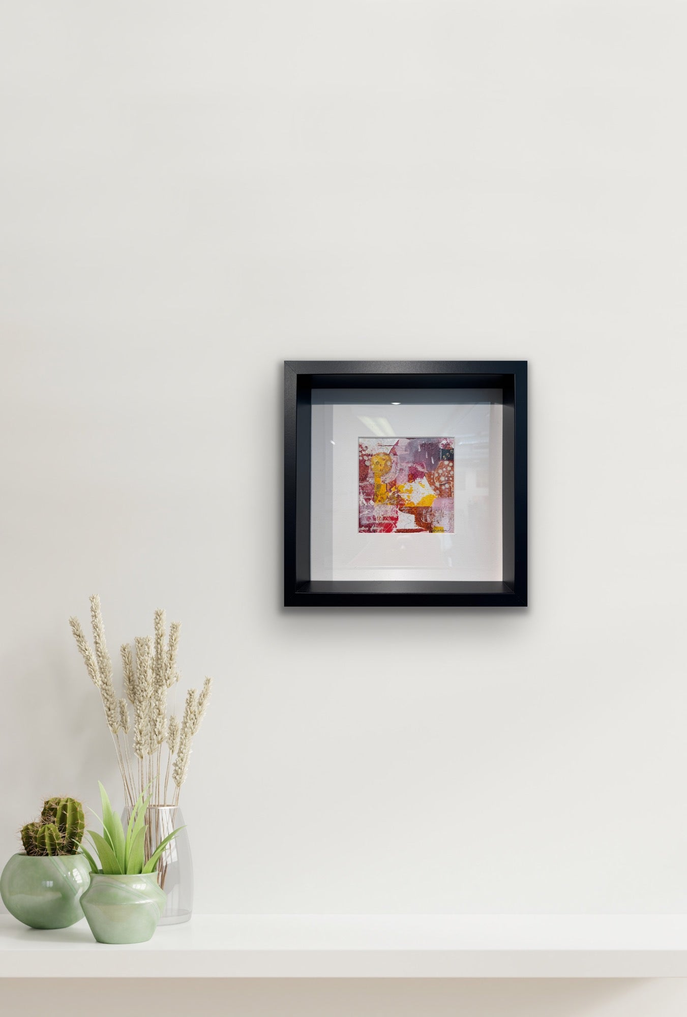 Beskrivelse: AKrylmaleri med struktur og akrylink på papir. Innrammet i "innboks" med passepartout.